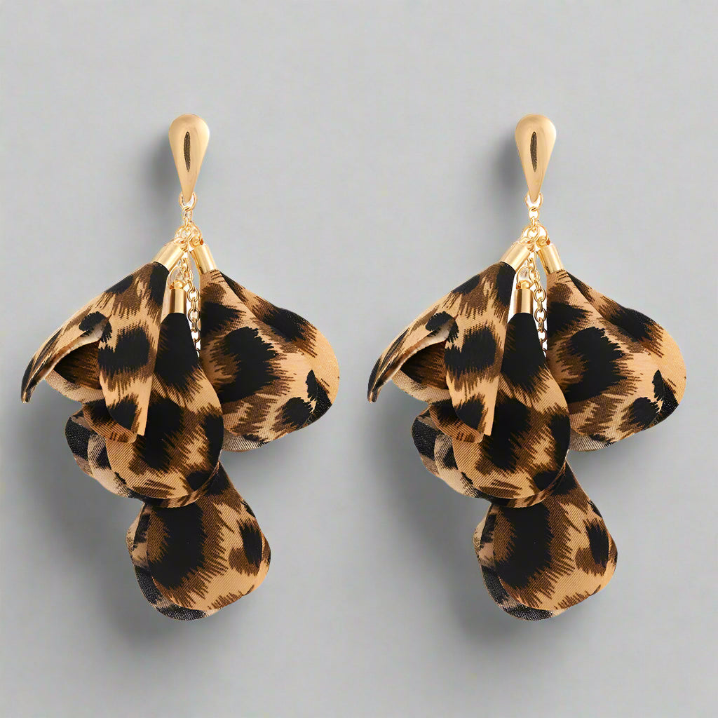 These elegant earrings feature a striking leopard petal pattern accented with refined gold embellishments. Designed to complement your evening attire, they add a touch of luxury and sophistication, making them the perfect accessory for a stylish night out or special event.