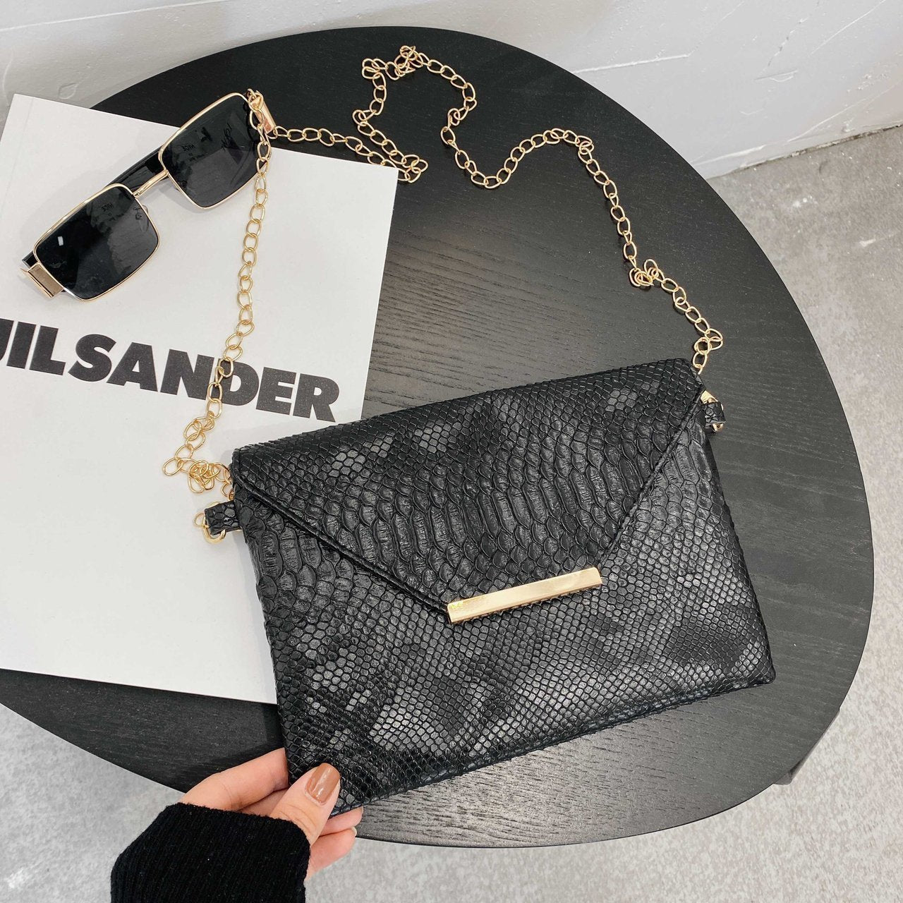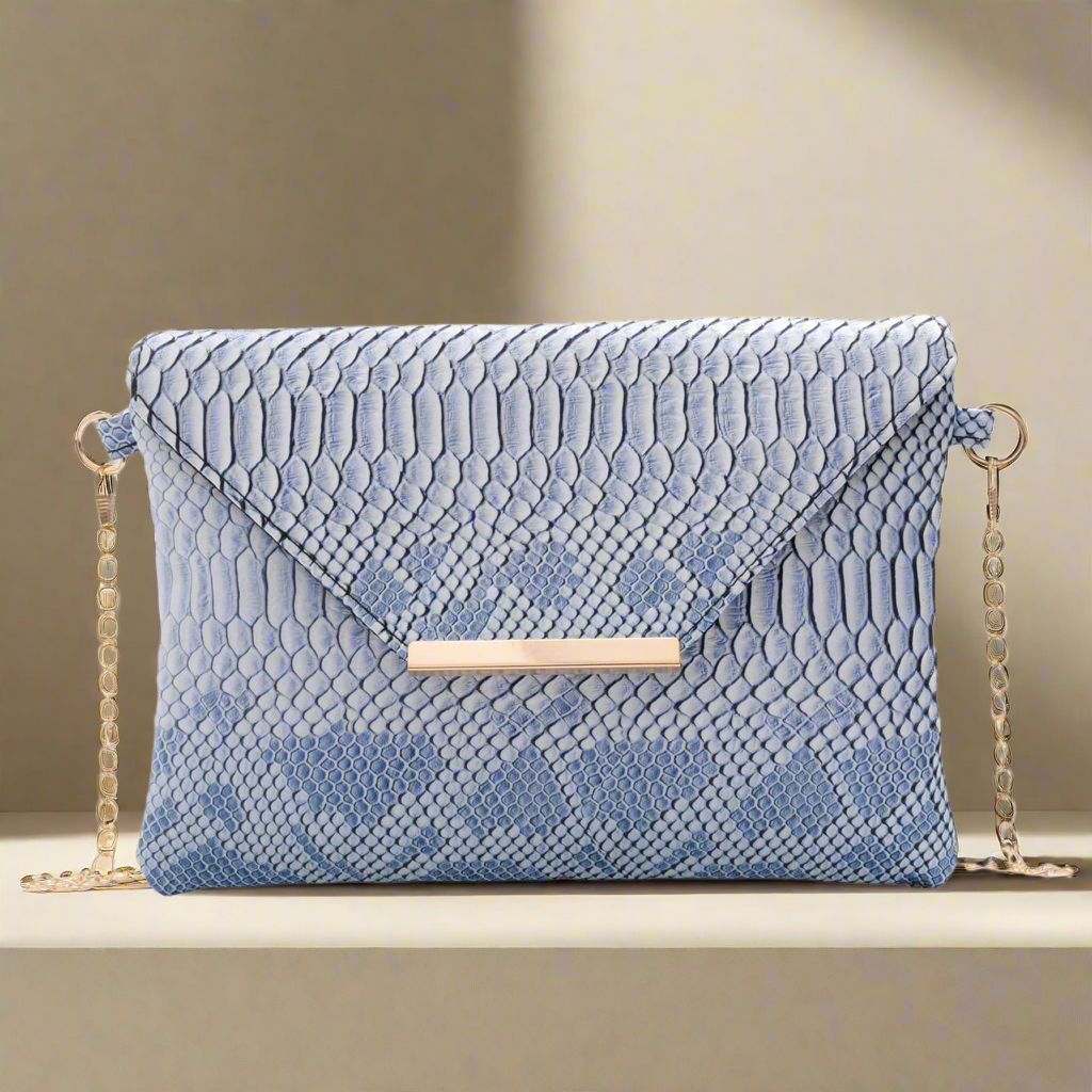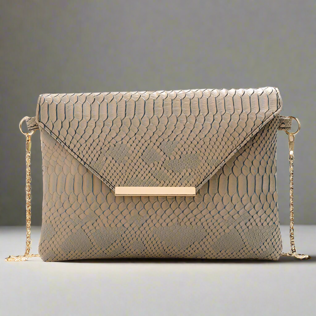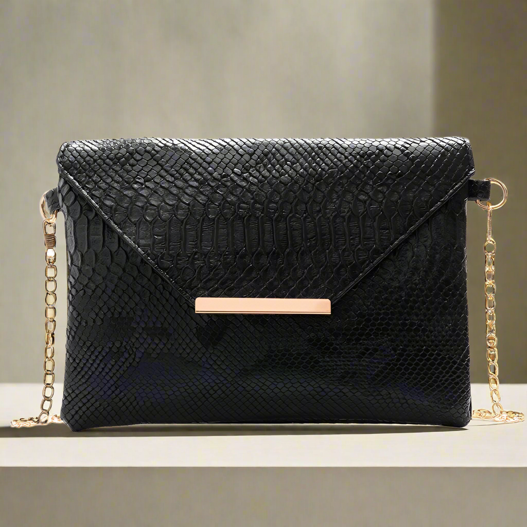 This stylish envelope bag showcases a refined snake print complemented by a sleek gold chain strap. Designed with a magnetic button closure, it offers both elegance and convenience. Ideal for adding a sophisticated touch to your outfit, this crossbody bag blends fashion with functionality effortlessly.