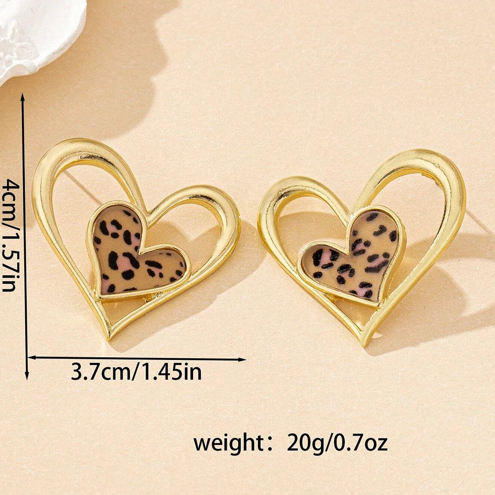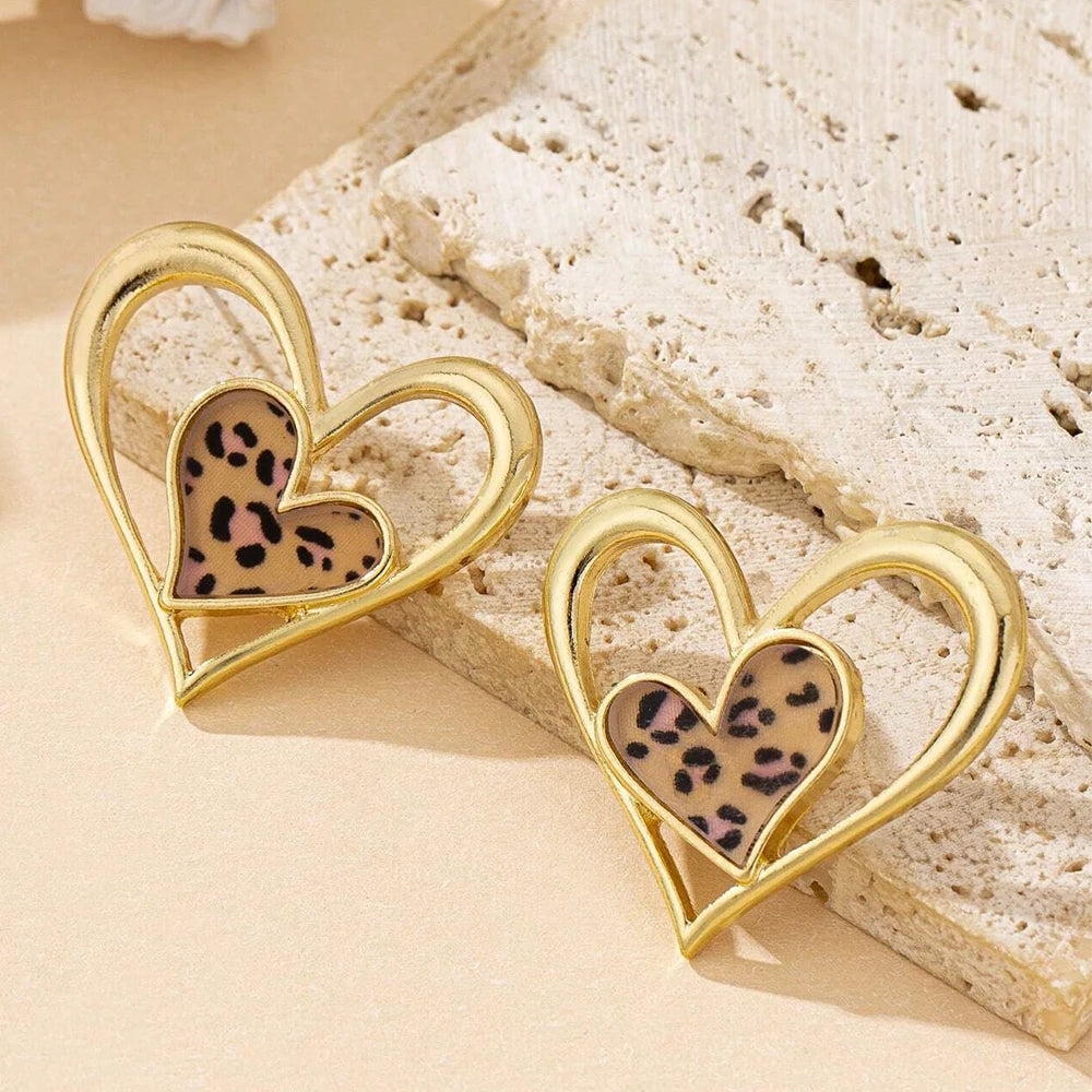 These gorgeous double heart earrings blend gold tones with leopard print accents for a sophisticated statement. Their elegant design adds a touch of refined charm, perfect for elevating any ensemble with subtle animal print allure.