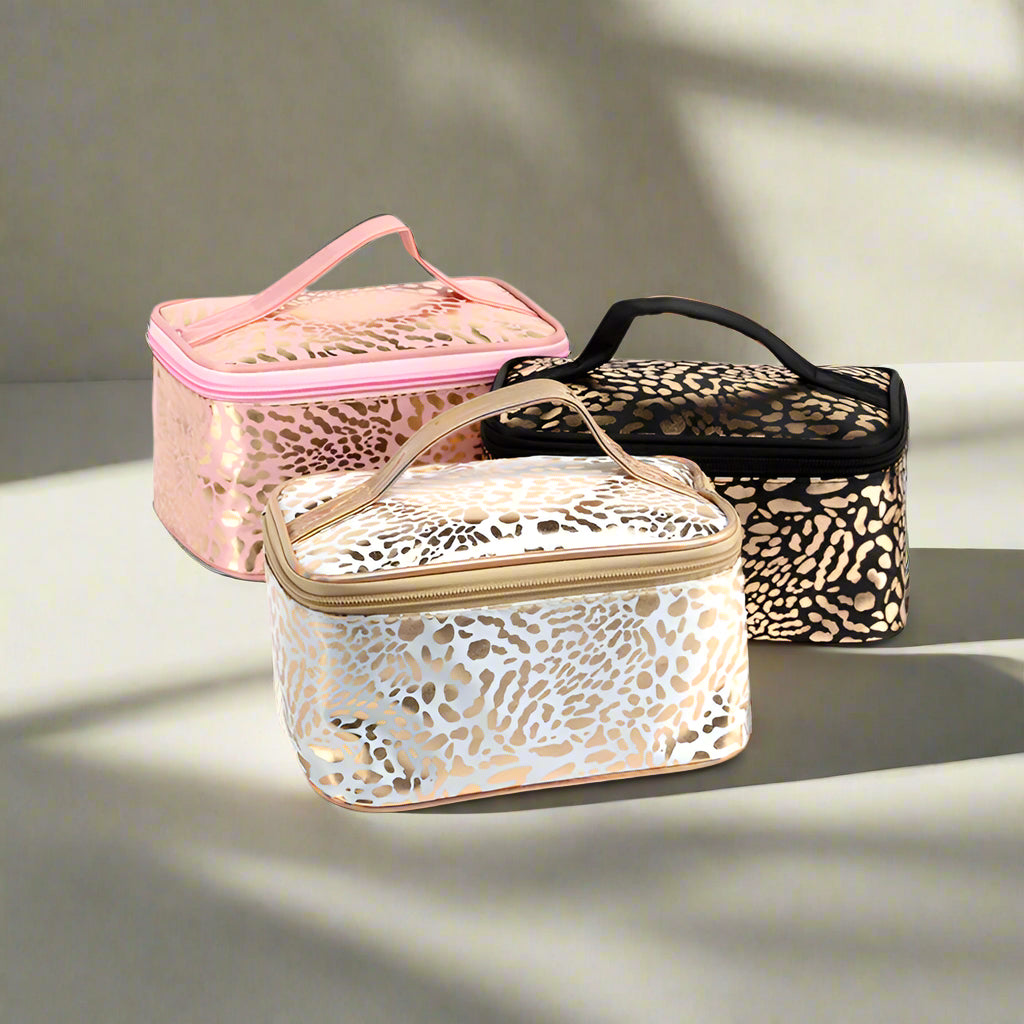 This elegant and fun cosmetic bag showcases a luxurious gold foil leopard print, combining style with practicality. It features a sturdy handle for easy carrying, a secure zipper closure, and thoughtfully designed inner compartments to keep your cosmetics neatly organized. Ideal for both travel and daily use, it offers a refined way to store your beauty essentials.
