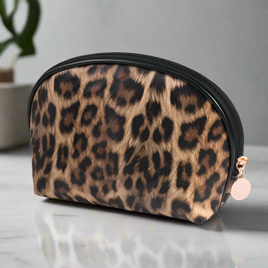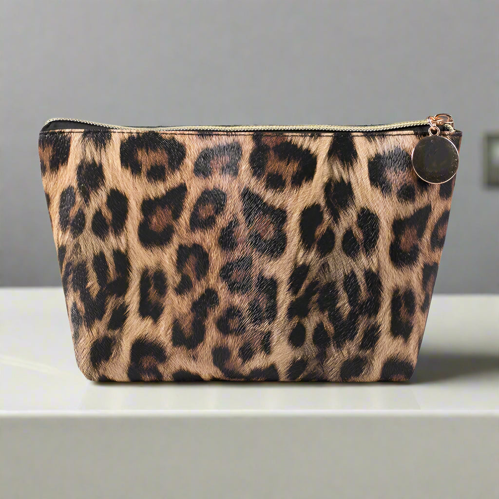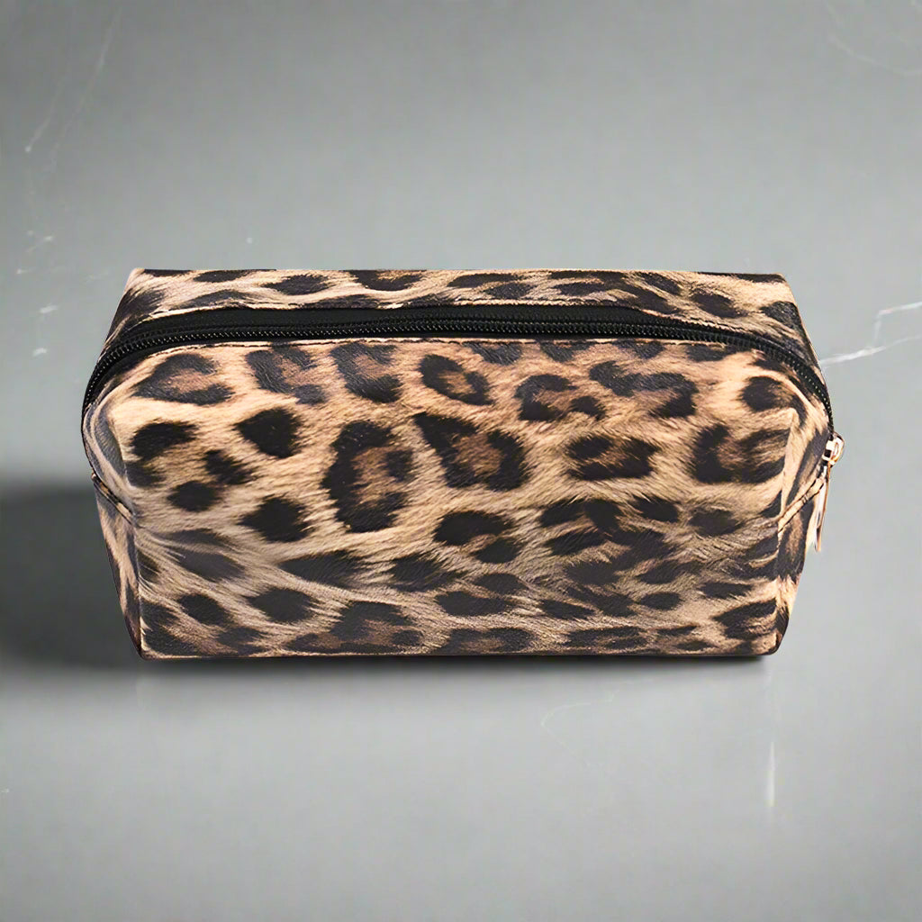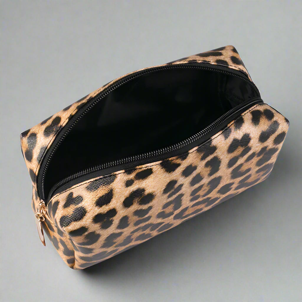 Crafted from durable PU material, this Leopard Makeup Bag combines practicality with style. Featuring a striking leopard print and a sleek black zipper, it is accented by a refined gold zipper pull that adds a touch of elegance. Perfect for organizing your essentials with sophistication.