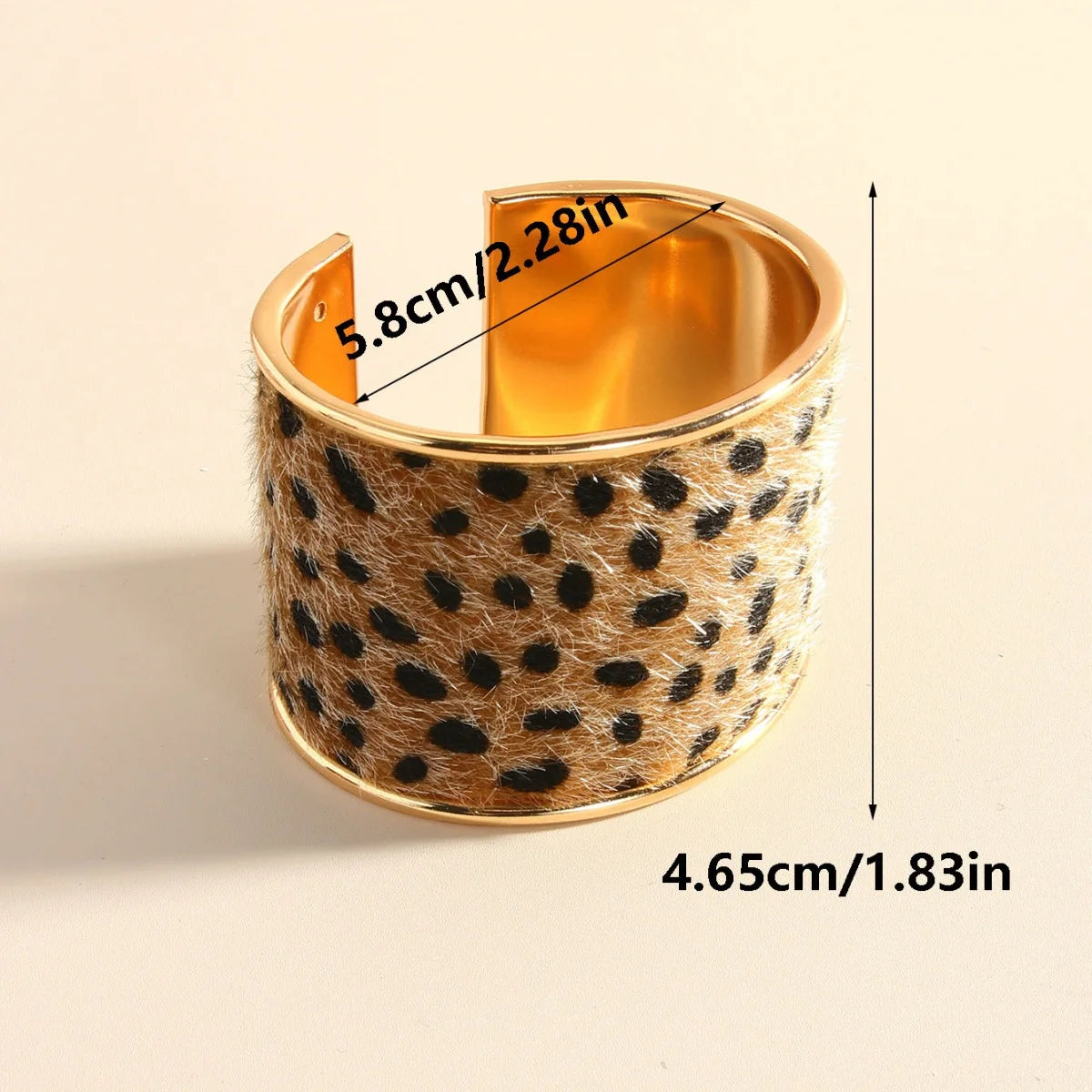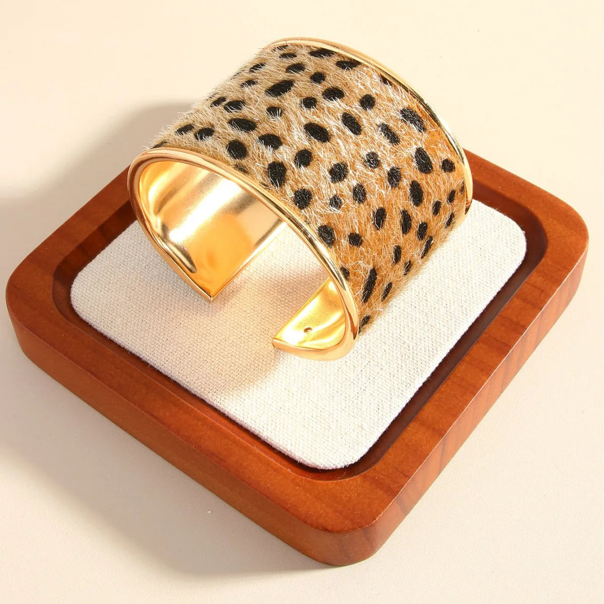 Make a bold statement with this sophisticated wife cuff bangle, featuring a striking leopard print set on luxurious gold metal. Its distinctive design effortlessly combines elegance and edge, perfect for adding a refined touch to any outfit.