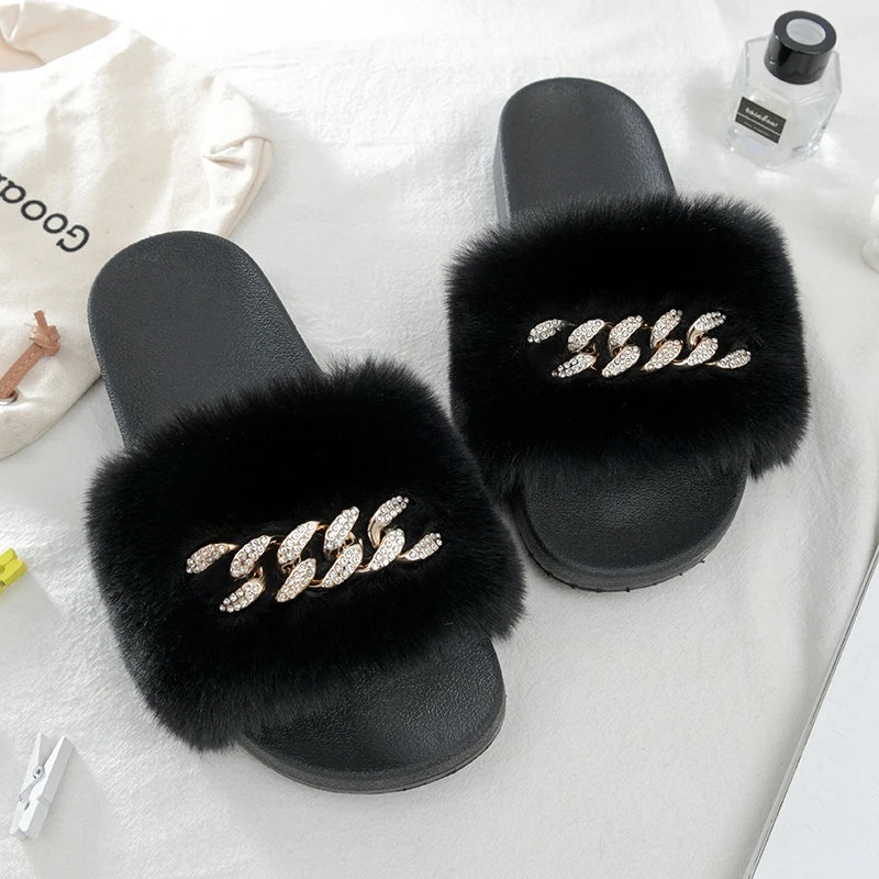 Indulge in luxurious comfort with these Leopard Print Furry Slippers, featuring soft faux fur that feels gentle against your skin. The elegant gold chain detail adds a refined touch, making these slippers perfect for stylish relaxation at home. Experience warmth and sophistication in every step.