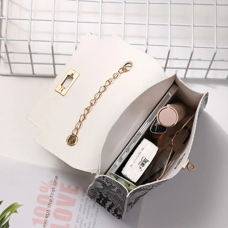 This sophisticated messenger bag features a striking python print crafted from premium PU leather. Enhanced with a sleek gold chain, it combines edgy style with elegant functionality. Perfect for carrying your essentials, this bag adds a refined, fashion-forward touch to any outfit.